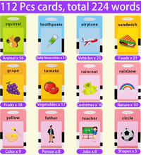 1. The kids toys contain 112 sight words flash cards - 224 words. Your baby can learn different animals, vehicles, foods, fruits, colors, vegetables, daily nesessities, costumes, nature, persons, jobs and shapes.